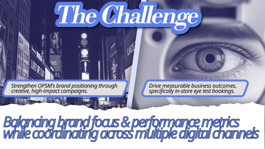 OPSM faced the challenge of reinforcing its brand positioning through creative, high-impact campaigns. At the same time, it needed to drive measurable in-store outcomes. Specifically, it aimed to increase eye test bookings. Resources were limited and consistent messaging was required across multiple channels. To balance long-term brand-building with short-term performance metrics, a sophisticated, data-driven approach was needed.