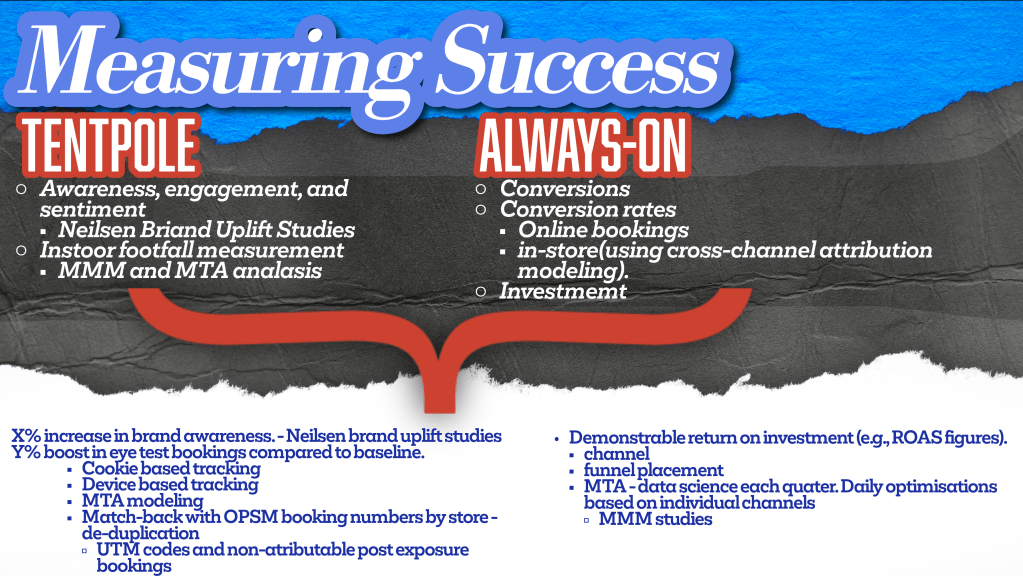 - Performance Campaigns: A significant boost in conversion rates for in-store eye test bookings, with an impressive return on investment (e.g., X% lift in ROAS).